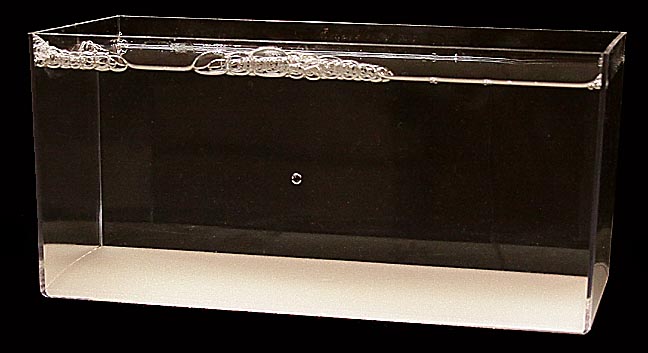 3. The author states that any electric potential difference between the antibubble forming solution in the squeeze ball and the solution in the tank in which the antibubbles are being formed discourages antibubble formation. The prevent this he suggests using a wire in contact with both solutions to keep them at the same potential. I did not find any difference in the rate, size or longevity of antibubbles produced with the wire in or out of the tank solution. He also states that connecting a 5 to 20 microfarad nonpolarized capacitor between the forming solution in the squeeze ball and the tank solution helps even more. Again, I did not note any difference between the antibubbles formed with and without the capacitor.