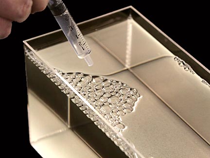 My antibubble system uses a clear plastic box with six cups of water, half a cup of clear dish soap mixed in and half a cup of sugar allowed to settle undisturbed on the bottom. I've experimented with several different brands of clear dishwashing soap and they all work the same. The box is covered and allowed to sit overnight. By morning the bottom half of the container has a layer of high density sugar water on which antibubbles will float. The box I use is an eight inch long plastic collector's display box from Michael's craft stores. Next I have a small diameter straw to blow surface bubbles, a small eyedropper or syringe for releasing individual drops and a glass for the antibubble solution containing one cup of water, 4 teaspoons of clear dish soap and four teaspoons of sugar, all mixed together until the solution is clear. The amount of soap is not critical. I've had success using as little as one teaspoon per cup of water to ten teaspoons per cup. Less than four and the surface bubbles don't last long enough to be convenient. More is a waste since it doesn't work any better.