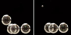The bubbles should be small, on the order of 1/4-inch across. As the drop hits them, the surface of the bubble gently enrobes it with a layer of soapy water with much less impact than if the drop were to strike the water directly. This thin layer of soapy water then merges with the real surface of the water enclosing the antibubble. The ideal release height depends on the size of the bubbles and the concentration of soap in the water. For the concentration discussed in the next section, that height is about one inch. It's necessary to move around to find a spot that produces antibubbles. Once it's found, they can be created in an almost constant stream.