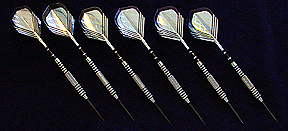 I rewarded myself for throwing an 804 by purchasing a set of good darts to replace the Halax cheapos ($1.89 for three darts) I had been using. Vickie Williams, the manager of Darts and Things (http://www.dartsandthings.com), very graciously spent an hour with me letting me try different darts and helping me with my technique. In the end, the darts that felt the best were 24-gram Great Whites.