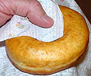 Quickly use the towel to blot off any oil on the surface of the doughnut. Be careful, even if the doughnut looks dry it can have enough hot oil on it to cause a serious burn. (Placing a doughnut on a rack "to drain" is fictitious. Try it and except for the few drops that fall back into the cooker when the doughnut is pulled out, the remainder soaks in. Blotting removes some of the surface oil that can make the doughnut taste greasy and prevent the glaze from adhering to the doughnut.)