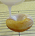 Once the doughnuts are cool, place one on a wire rack held over a wide mouthed container and pour the glaze over the doughnut, completely covering it. Let the excess drip off into the wide mouthed container. After it's done dripping, transfer the doughnut to another rack, get a second doughnut and repeat the glazing process. When the first container runs out of glaze, trade it for the one under the rack and continue. (I've tried dipping and brushing the glaze on and found that the pouring technique provides the quickest and best coating by far.)