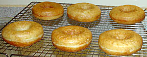 Place the doughnuts on a wire rack to cool for 15 to 20 minutes. I like to elevate the rack several inches off the kitchen counter so that the bottoms of the doughnuts aren't kept warm by reflected heat. If they do, then grease inside the doughnut will tend to migrate to the warmer areas from the cooler areas and make sections of it greasy. (Note the light ring around the middle of the front three doughnuts. This is caused by the gas in the doughnut expanding so much when it hits the hot oil that the middle of the doughnut is kept slightly above the oil so it doesn't cook as much. If doughnuts don't raise high enough they won't float high enough and the middle of the dough will end up getting cooked twice, once as each side of the doughnut is fried. This results in a dark band around the middle, as can be seen in the doughnuts in the back row. These doughnuts will not be as light as the front row. They also have the risk of being greasier because they have less gas there to expand so there is less escaping gas to push outward preventing the liquid oil from getting into the doughnut. If your first doughnut has a dark band, let the rest raise more before trying to fry them. Also, no matter how evenly the dough is rolled out, there will always be some variation in thickness. Consequently some doughnuts will raise faster than others. When selecting which to fry first always choose the ones that have risen the highest.)