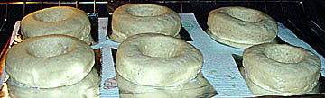 A large wood cutting board (10 x 14 inches or larger), rolling pin, and cookie sheet in an oven warmed to 100 degrees. The cookie sheet should be upside down, covered with two layers of paper towel, and topped with eight rectangles of Teflon coated aluminum foil, Teflon side up. Each piece of foil should be lightly coated with flour. (The pan's upside down so you don't have to fight the lip to lift the raised doughnuts up, the paper prevents the highly heat conductive pan from letting too much heat flow into the doughnuts and killing the yeast, and the foil allows you to lift the doughnuts by sliding a spatula under them without disturbing them.)