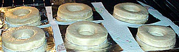 Fifteen to 20 minutes later they should be 1 and 1/2 inches high or higher. If not, then give them another five minutes. Check to make sure the oven is kept at an even 100 degrees. (The reason for warming all the ingredients, cutting board, and raising pan is to to keep the dough warm so it raises faster. Using this technique the doughnuts will raise as high in 15 minutes as they might in an hour or more if cold ingredients and instruments are used.)