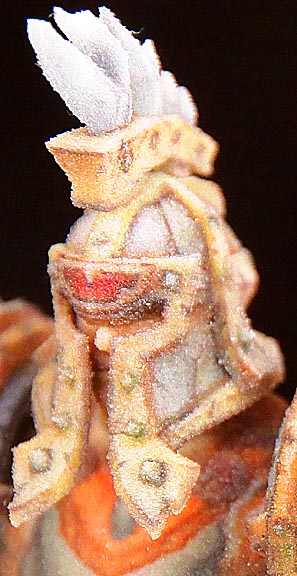 Again, the graininess in this image is not visible in person. This close-up shows some of the extremely delicate detail that could not be produced by even the finest hand carving. Look closely at Macdermott's chin and left cheek. They are completely formed far under the face guard. The helmet really looks as if it's sitting on his head.