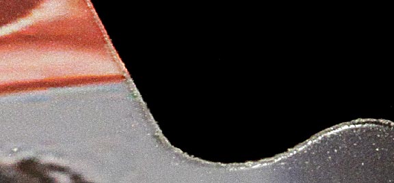 Not only does the reground blade cut a kerf that's half the 3/0 blade, it's also smoother. Examine the following highly magnified image of the edge of a puzzle piece cut with this blade after it had cut 80 other pieces: