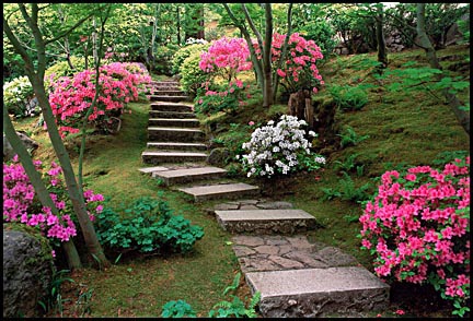 Scale also plays a part in the idea of an inviting image. The walkway above through boxwood and azaleas is close enough to imagine standing on the walkway. Distant vistas of grand mountain scenes may be beautiful, but are so far away and vast in expanse that you can't see a specific area to be at. This makes them less inviting. Aerial views of such scenes are even less inviting.
