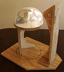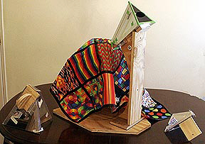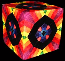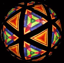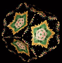 The idea is to use a quilt made out of many different pieces of cloth, each with a bright and interesting pattern, as the object to be viewed through the kaleidoscope. Each segment is connected to its neighbors with 1/2-inch wide strips of black ribbon. This black edging turned out to be the most important part of the quilt because it creates interesting geometric patterns. Light shining through the cloth illuminates it making the image in the kaleidoscope appear to glow. The cloth is draped over a dome that houses the lighting system. The quilt can be slid and rotated over it to create an almost infinite array of unique images.