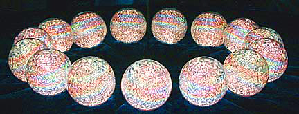 The first kaleidoscope is titled String of Pearls, after the Glenn Miller song of the same name. It's a simple two-mirror kaleidoscope where you look in toward the mirror joint instead of down along the joint. The object is a 1-inch diameter pearlized glass sphere filled with crystal beads resting on a bed of royal blue velvet. This creates a string of pearl-like images, hence the name. What makes this kaleidoscope somewhat novel is that the illumination comes from the inside of the pearl and changes in brightness in synchronization with music played on a built-in tape recorder. The color of the light coming from the pearl also changes from red to yellow, green, white, purple, blue, and orange.