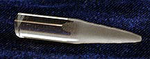 One of the problems that had to be solved was getting uniform illumination from the pearl. I tried several schemes involving etching or painting the glass sphere but the best results came from filling it with very small crystal beads (though I admit this makes it look less like a pearl than what was desired) and directing the light into it through a frosted conical lens fabricated from a 2-inch length of glass rod.