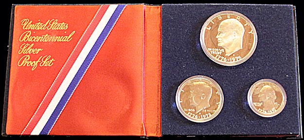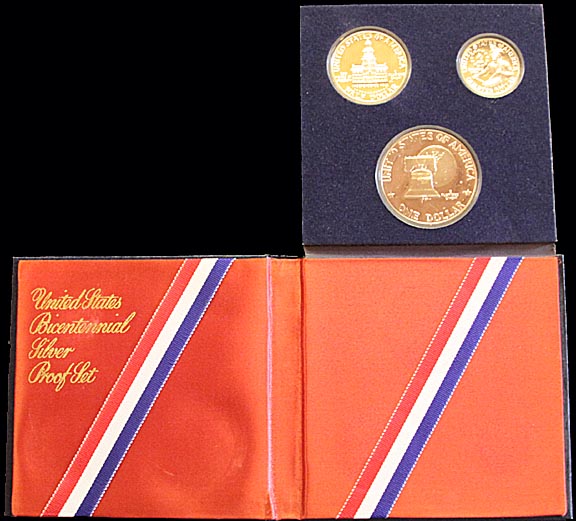 Bicentennial silver proof sets come in a 4-inch square blue cardboard holder with gold lettering on the cover.