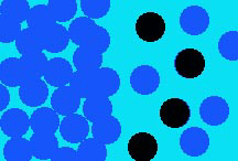 Here we have the same water/ice mixture we had in the first picture, except this time salt (black spheres) has dissolved into the water and displaced some of the water molecules. Although the water now contains some salt molecules, the same number of collisions occur on the ice as before, maintaining the same rate of ice molecules being freed to join the free-swimming water molecules. BUT, because the salt molecules have replaced some of the water molecules in the water not as many water molecules collide with the ice and therefore there are fewer of them that can freeze to it. (The crystalline structure of the ice prohibit salt molecules striking the ice from becoming incorporated into it. The nature of the molecular bonds repels the salt.) Net result: there are more ice molecules melting than there are water molecules freezing. Because the salt isn't used up in this process the melting continues as long as the water flowing from the ice doesn't wash the salt away. This is why only a little salt is needed to melt a lot of ice.
